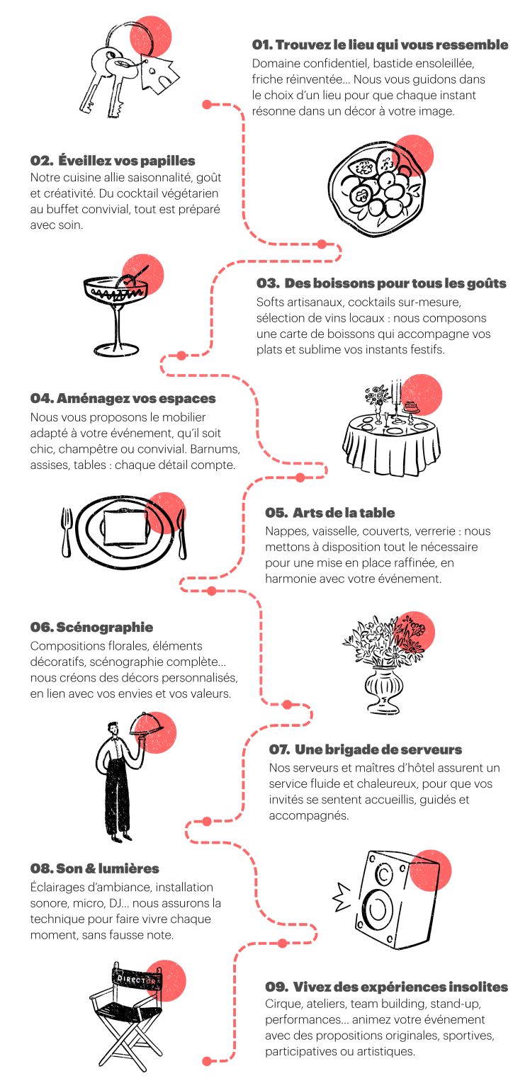 Un événement, c’est tout un chemin : de la première idée au dernier coup de balai. Et la bonne nouvelle, c’est qu’on s’occupe de tout..